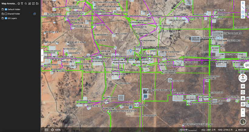 Oil and Gas companies will import GIS data into Flighthub 2. This is useful for situational awareness and planning missions. The type of data that is important can include pipelines for crude oil (often shown in green), CO2 pipelines or reclaimed water/slurry lines (commonly in purple), wells, processing facilities, storage tanks, transport networks, power lines, access roads, and section boundaries to ensure safe and efficient operations in the field. This data is typically already available and easy to import from a GIS database to Flighthub 2 as a KML or KMZ.